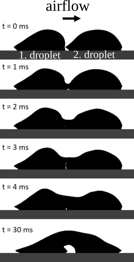 On basis of the results obtained, the field of research is extended to the Interaction of two droplets. The influences of the interactions on the motion behavior, i.e. the critical velocity at which a droplet starts to move, as well as droplet-droplet interactions (coalescence processes) will be investigated. In addition to varying the arrangement and droplet size, material and substance parameters are also varied.