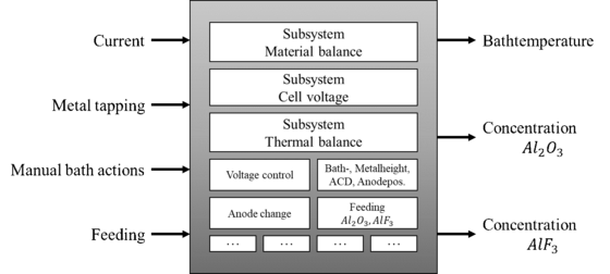 One step to achieve these goals is the development of a digital twin for numerical modelling of the aluminium electrolysis process. The present Simulink model can generally represent the Hall-Héroult process. It is specified for the common process configurations of the electrolytic cells of TRIMET Aluminium SE, the cooperative industrial partner in aluminium production. The digital twin will be mainly used to predict the bath temperature. On the one hand for variable current modulations, regarding the predicted energy costs and fluctuations. On the other hand, to reduce the need for laborious temperature measurements. The model contains a large number of process parameters. These are constantly measurable values or time-variable signals and some estimations or experience values.